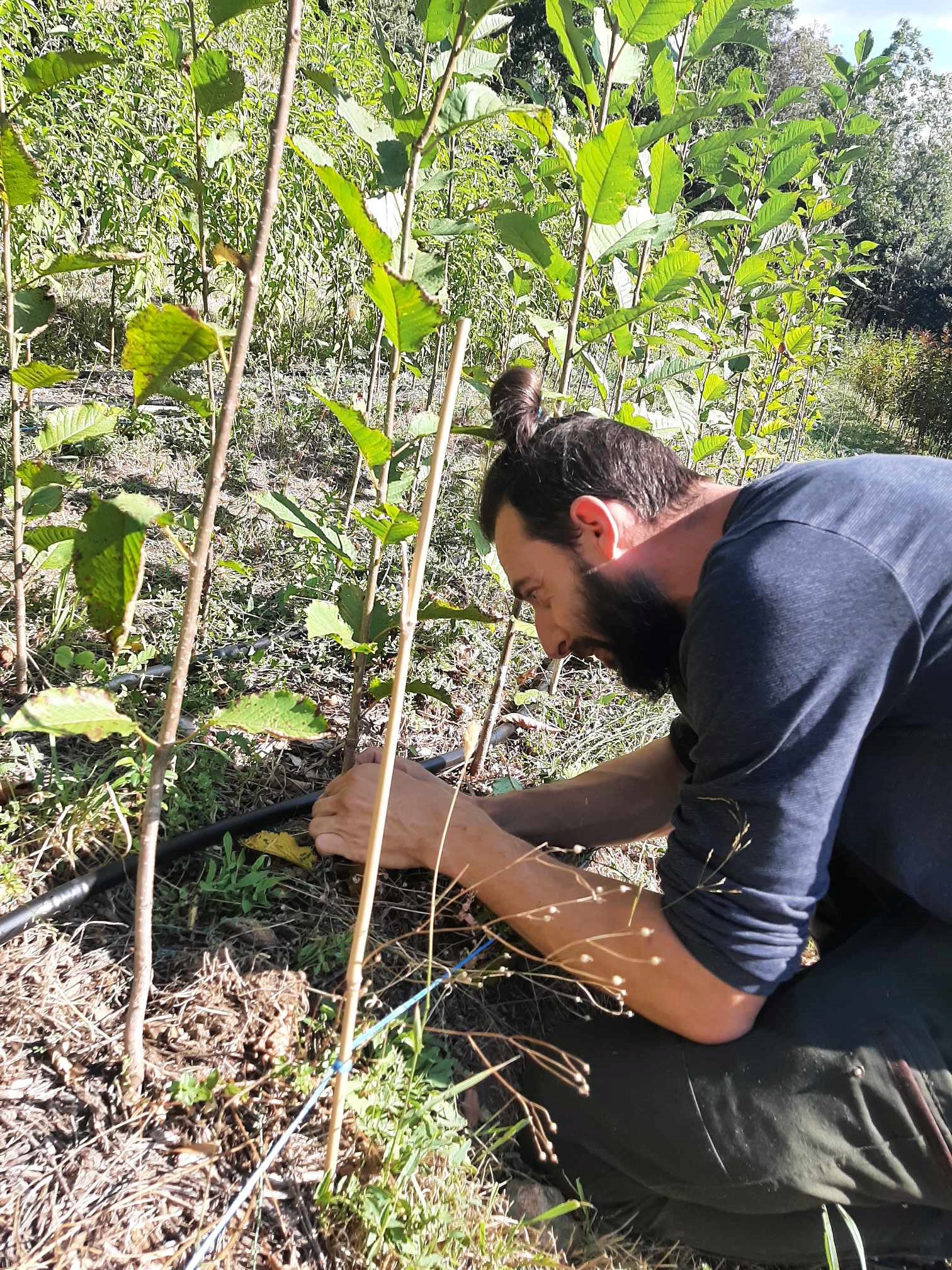 J’ai à cœur de proposer des arbres de qualité. Pour cela, je travaille manuellement, dans le respect de la nature, sur des planches de cultures permanentes. Ces bandes de cultures sont travaillées une seule fois par an grâce à un outil manuel qui vient décompacter le sol, l’aérer et ensevelir le paillage en cours de décomposition. Chaque année, le sol est nourri à base de fumiers locaux, de purins fabriqués sur place et d’engrais organiques. Il est couvert en permanence de foin, paille ou BRF afin d’éviter l’évaporation des eaux utilisées pour les arrosages, limiter les besoins en eau des plantes et nourrir le sol lentement par la décomposition des paillis.